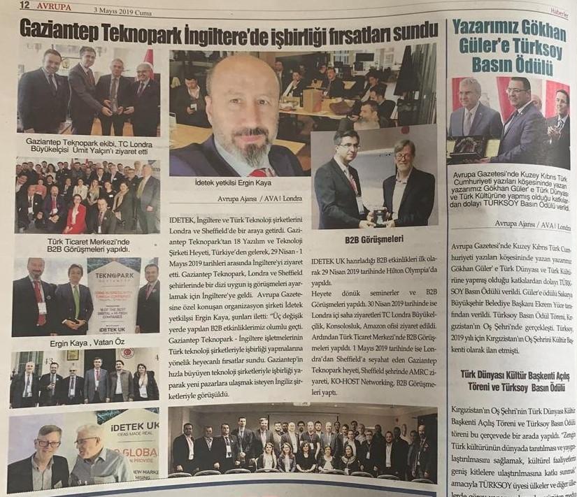 IDETEK, İngiltere ve Türk Teknoloji şirketlerini Londra ve Sheffeld'de bir araya getirdi. Gaziantep Teknopark'tan 18 Yazılım ve Teknoloji Şirketi Heyeti, Türkiye'den gelerek, 29 Nisan - 1 Mayıs 2019 tarihleri arasında ziyaret etti.
