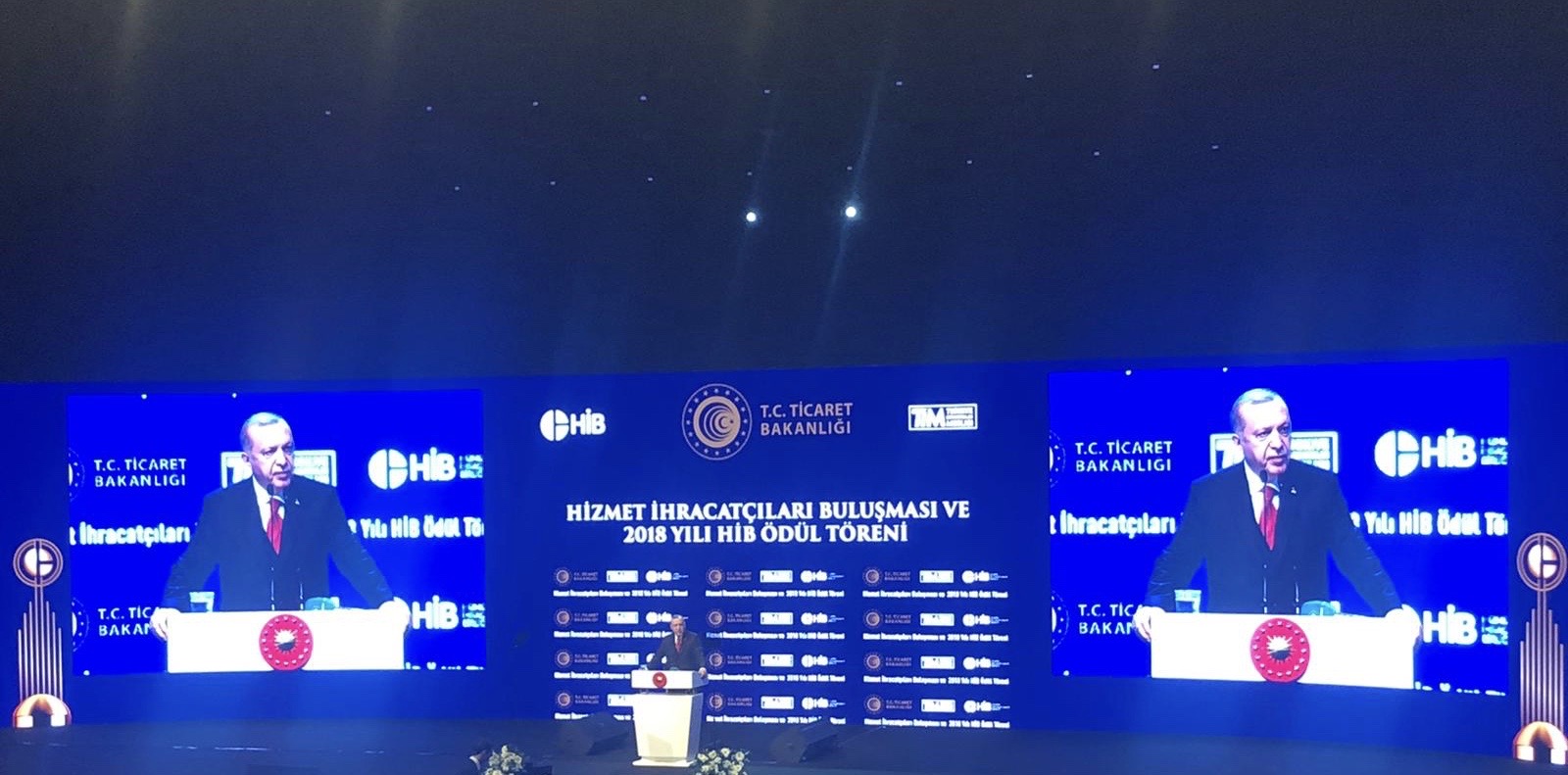 Hizmet İhracatçıları Buluşması ve 2018 Yılı Hizmet İhracatçıları Birliği (HİB) Ödül Töreni", Cumhurbaşkanı Recep Tayyip Erdoğan, Ticaret Bakanı Ruhsar Pekcan, Sanayi ve Teknoloji Bakanı Mustafa Varank, Aile, Çalışma ve Sosyal Hizmetler Bakanı Zehra Zümrüt Selçuk, Sağlık Bakanı Fahrettin Koca ile çok sayıda bürokrat ve iş insanının katılımıyla İstanbul Kongre Merkezi'nde gerçekleştirildi.